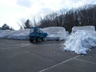 駐車場、除雪は脇へ、脇へと雪を押しのけて面積を確保するので、春になると凄い雪山出現。